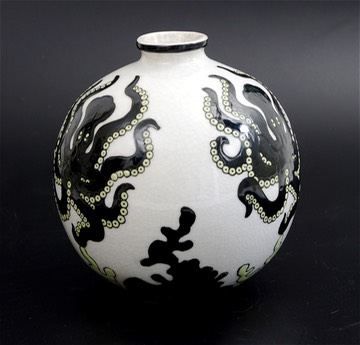 Description: Contempary Art Deco style octopus vase in the manner of Boch Frères, enamelled