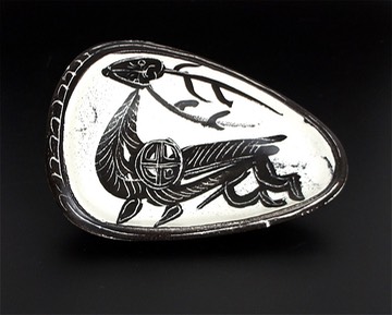 Description: Rare, white, glazed ceramic dish painted in black with details in