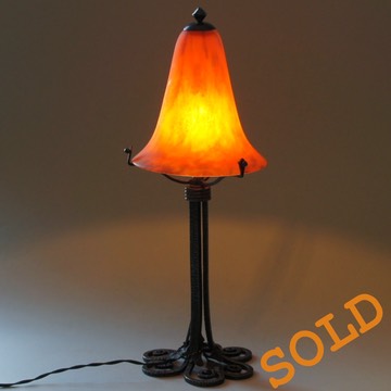 Description: Outstanding original French Art Deco wrought iron table lamp with orange/yellow